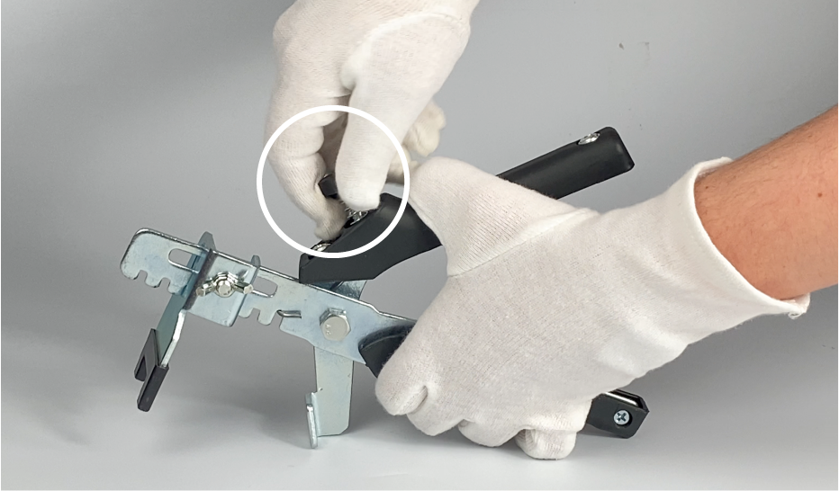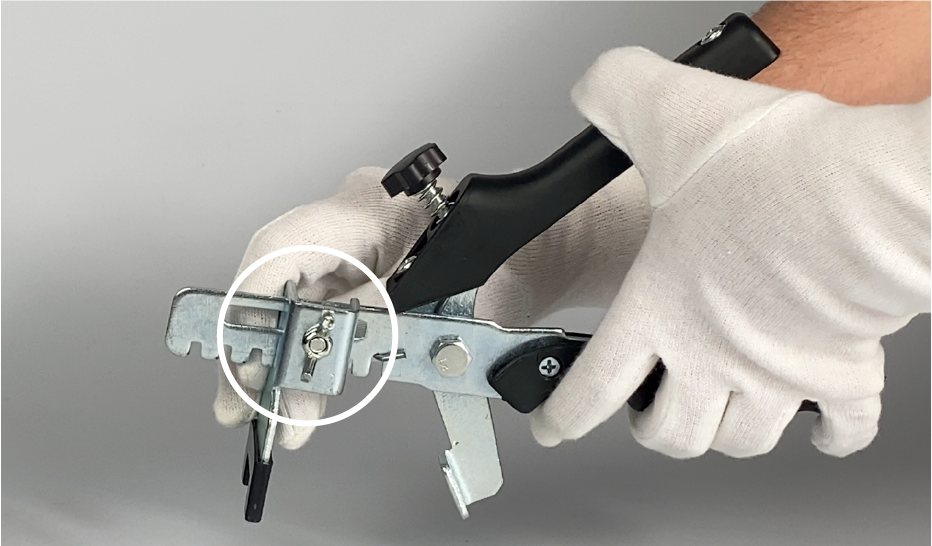 Utilizando el tornillo de mariposa, deslice el cursor a lo largo de la herramienta hasta que esté en la posición deseada según el grosor de la loseta que va a nivelar. Apriete firmemente el tornillo de mariposa para asegurar el cursor en su lugar.
